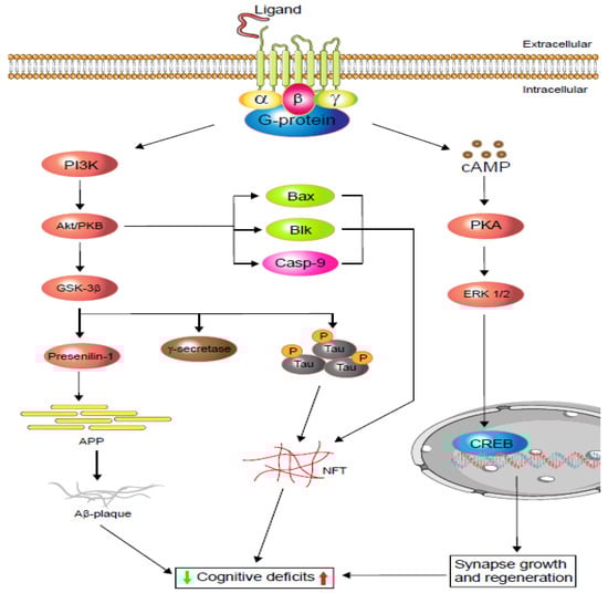 Schematic display of G-protein-coupled receptors (GPCRs) signalling in cognitive impairment. Depending on the agonist or inverse agonist ligand binding, the PI3/Akt-signalling pathway signals Bax and Casp-9 while increasing neurofibrillary tangle (NFT) formation via phosphorylation. PI3/Akt-signalling hyperphosphorylation also activates glycogen synthase kinase-3β (GSK-3β), which increases either or both tau protein phosphorylation and amyloid precursor protein (APP). Phosphorylated tau protein forms neurofibrillary tangles (NFTs) and regulates cognitive function. Similarly, APP metabolism regulates Aβ-plaque formation and controls cognition. Moreover, neuronal and dendritic plasticity is required for synaptic growth, regeneration, and memory formation, and it depends on extracellular signal-regulated kinase (ERK ½) modulation. Depending on the ligands, GPCRs activate cAMP-response element-binding protein (CREB) via the cAMP/ERK ½ pathway and regulate cognition (based on [,]).