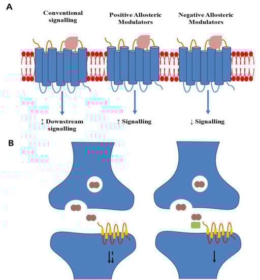 Schematic display of allosteric modulator action on GPCRs. (A) Conventional agonist binding makes conformational changes and activates downstream signalling. Positive allosteric modulators bind to a distinct site and enhance conventional ligand-induced signalling. Negative allosteric modulators binding decreases conventional agonist efficacy and reduces downstream signalling. (B) In normal physiology, neurotransmitters are released into the synaptic cleft, binding to postsynaptic GPCRs, and activating downstream signalling. The duration of signalling can be degraded by metabolizing enzymes. A positive allosteric modulator (green rectangle) cobinding with the metabolites can extend the duration of receptor activation and enhance signalling (based on []).