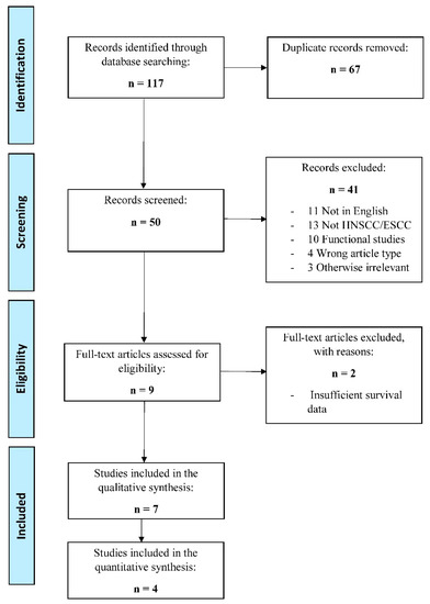 We included original research articles that investigated the relationship between VM and the survival outcomes of patients with HNSCC or ESCC. We excluded review articles, case reports, case series, and reports lacking survival data. The detailed inclusion and exclusion criteria are listed in Table 1.