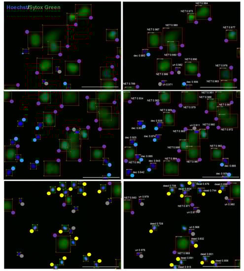 The adopted model trained on our preliminary dataset is able to detect objects with quality comparable to manual labeling. Images of unfixed neutrophils stained with Hoechst 33342 and SYTOX Green were analyzed by the CNN model (right) in parallel with manual analysis (left). To facilitate the assessment of labeling, colored dots are shown at one of the four vertexes of a rectangle surrounding the object. Grey dots are unstimulated cells (un), blue dots are decondensed cells (dec), violet dots are NETs, yellow dots are dead cells. Numerical values represent model’s confidence in the given cell class prediction—1 is maximum confidence, and the scale bar is 100 μm.