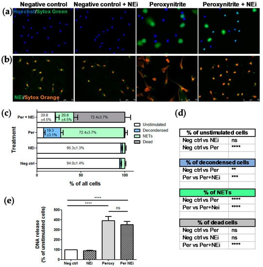Visual inspection of live images confirmed that NEi inhibited peroxynitrite-induced NETs release (Figure 3a). In peroxynitrite-stimulated samples, after 2 h of stimulation, we detected mostly NET-releasing or decondensed cells, whilst preincubation with NEi noticeably inhibited NETs formation and resulted in the predominance of small, condensed, double-positive objects. Importantly, NEi showed no signs of cytotoxicity in unstimulated samples and control neutrophils pre-incubated with NEi preserved their multilobulated shape (Figure 3a). No effect of NEi on the morphology of ustimulated cells and inhibition of peroxynitrite-induced NETs formation by NEi could also be observed in immunofluorescently-labeled samples (Figure 3b). Notably, in samples preincubated with NEi and stimulated with peroxynitrite large proportion of neutrophils’ nuclei lost their multilobulated shape, but no signs of decondensation were evident (Figure 3b). Analyses performed with the pre-trained CNN model remained in perfect agreement with aforementioned live microscopy observations. Vast majority (≥94%) of objects in negative control incubated with or without NEi were classified as unstimulated cells, most objects in peroxynitrite-stimulated samples were classified as decondensed or NET-releasing cells (19.3 ± 3.1% and 72.4 ± 3.7% of objects, respectively) and over 70% of objects were classified as dead cells in samples preincubated with NEi and further stimulated with peroxynitrite (Figure 3c). Statistical analysis confirmed significant differences in NETs formation between samples stimulated with peroxynitrite and samples preincubated with NEi and then stimulated with peroxynitrite (Figure 3d). On the other hand, simultaneous spectrofluorometrical measurements of DNA release failed to show differences in NETs formation between samples pre-incubated with or without NEi and stimulated with peroxynitrite (Figure 3e). There was only a slight, insignificant reduction in DNA release in samples preincubated with NEi and stimulated with peroxynitrite compared to samples not treated with this inhibitor. Overall, these results confirmed a good performance of our model, superior to DNA release measurement-based assay and its utility to readily assess NETs formation using live-cell imaging.
