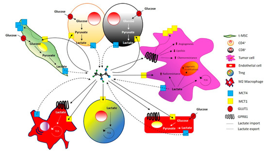 Additionally, lactate levels correlate also with radioresistance of many cancers [86]. Sattler U.G. et al. demonstrated that in human head and neck squamous cell carcinoma (HNSCC) xenografts, lactate concentration positively correlates with tumor resistance to fractioned irradiation [87]. Moreover, Koukourakis M.I. et al. proved that also LDH5 overexpression can be associated with radioresistance of HNSCC, prostate and bladder cancers [88,89,90]. At least in part, this effect could be due to the antioxidant properties of lactate as shown by its ability to prevent lipid peroxidation. Most likely, lactate could be used as a predictive molecule to hypothesize the therapeutic responses of tumor [91].