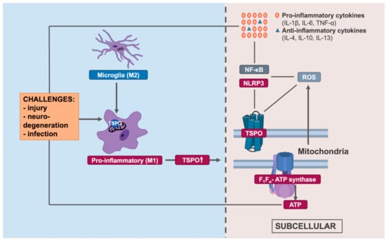 As a prominent molecular imaging biomarker of activated microglia in a range of pathologies, it is generally presumed that TSPO is an indicator of pro-inflammatory, aberrant microglial activation —hence “neuroinflammation”. However, the precise role of TSPO in the inflammatory processes of microglia during active disease states remains unclear. Furthermore, this is complicated by the known complexity of the functional states of microglia, most likely a spectrum from M1/M2 responses, depending on the stimulus [81]. The question of where on the spectrum TSPO is most prominently upregulated has been recently addressed by several studies. In a human microglial cell line, it was recently demonstrated that TSPO is directly involved in the modulation of pro- and anti-inflammatory phenotypes. TSPO mRNA expression was found to be greatest in cells after exposure to pro-inflammatory stimulation with IL-1β and IFN-γ. Differential secretion of pro- and anti-inflammatory cytokines could also be modulated by TSPO ligands and genetic knockdown. This was underpinned by mitochondrial ROS modulation, and NF-κB pathway expression, thereby underscoring TSPO in the mitochondrial processes of inflammatory responses [82]. Similarly, lipopolysaccharide (LPS) stimulation of mouse primary microglia resulted in increased TSPO expression in M1 microglia, though not in IL-4 treated M2 microglia. Thus, it was concluded that TSPO is specifically a biomarker of pro-inflammatory processes [83], a finding which has also been validated more recently in a similar experimental approach [84].