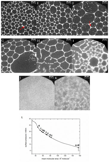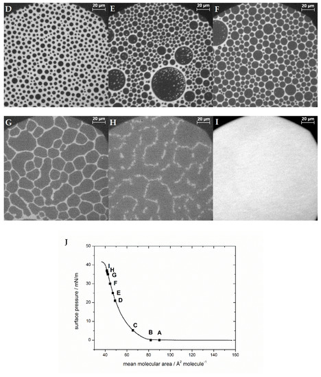 - Worthman, L.A.D.; Nag, K.; Davis, P.J.; Keough, K.M.W. Cholesterol in Condensed and Fluid Phosphatidylcholine Monolayers Studied by Epifluorescence Microscopy. Biophys. J. 1997, 72, 2569–2580. [Google Scholar] [CrossRef]