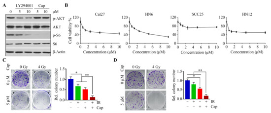 LY294002 can reduce AKT phosphorylation through inhibition of its upstream enzyme PI3K, while capivasertib is an ATP-competitive AKT inhibitor with the great potential to prevent the phosphorylation of AKT substrates [11]. We treated HN12 cells with these two inhibitors and compared the inhibitory effect on AKT signaling. As shown in Figure 3A, capivasertib at 5 µM completely inhibited the phosphorylation of S6 in HN12 cells, which was more potent than LY294002 at the same dose (Figure 3A). We then determined the IC50 of capivasertib among the OSCC cell lines. The IC50 of capivasertib in three out of four cell lines (Cal27, HN6, and HN12) was approximately 5 µM (Figure 3B). At this dose, capivasertib enhanced radiosensitivity of HN12 (Figure 3C) and re-sensitized HN6R cells to IR (Figure 3D).