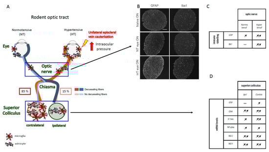 Elevated intraocular pressure (IOP) over 40 days after episcleral vein cauterization (EVC) in rat induced astrogliosis and microgliosis in the optic nerve and superior colliculus. (A) Diagram showing the rodent neuronal visual pathway. Immunofluorescent labeling of glial fibrillary acidic protein (GFAP) and ionized calcium binding adaptor molecule 1 (Iba1) in (B) naïve, contralateral (normotensive, NT), and hypertensive (HT) optic nerves. Scale bar, 100 μm. (C) Table of the variations of GFAP and Iba1 immunofluorescence levels in the NT and HT optic nerves, 40 days after EVC. (D) Table of the variations in the mRNA expression levels of inflammatory markers (i.e., GFAP, CD68, IL1β, TNFα, Nox2, and Nox 4) in ipsilateral and contralateral superior colliculus (SC), 40 days after EVC (Adapted from Sapienza et al.).