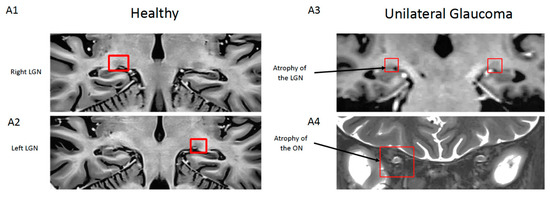 A magnetic resonance imaging (MRI) study showed that all unilateral glaucoma patients exhibited bilateral involvement of their visual pathways, with the clinically symptomatic side predominating [108]. Much of the data seem to indicate that glaucomatous pathology for the most part results in retinal–thalamic visual pathway impairment. MRI analysis has made it possible to observe all of the secondary visual neurons. So, as previously mentioned, a relatively old histological study performed on postmortem tissues from glaucoma patients found lower neuronal density in LGN in patients than in the controls [103]. More recently, MRI studies confirmed this LGN atrophy in glaucoma patients (Figure 2) [109,110,111] as well as a thinner cortex of the visual pathways [112]. The diffusion–tensor imaging technique, which quantifies white matter abnormalities, was also used in glaucoma patients and demonstrated changes in white matter at the level of the optic radiations that project to the visual cortex [113,114,115]. MRI has also provided evidence of a decrease in gray matter density in the primary visual cortex in glaucoma patients compared to healthy subjects [116,117]. Finally, a resting state functional MRI study showed an alteration of functional connectivity between the primary visual cortex and the associative (secondary) visual areas [118]. These noninvasive neuroimaging and functional studies in glaucoma patients have shed light on the cerebral abnormalities of visual pathway structures such as atrophy, a loss of density, or an alteration of the communication between the visual areas.