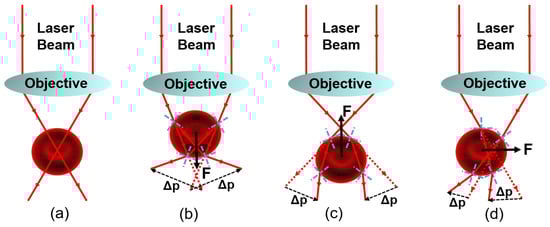 Illustration of trapping light propagation and the optical force exerted on a particle (RBC—red blood cells) that can be considered as a weak positive lens. (a) No momentum change as light propagates through the RBC placed at the beam focus. (b) Divergent refraction accompanied by a momentum increase of the RBC and the corresponding optical pushing force towards beam propagation. (c) Convergent refraction induces a momentum decrease of the RBC and optical force acts to pull the RBC in the opposite direction of beam propagation. (d) Left deflective refraction by the RBC on the left side of the beam focus results in a rightwards optical force exerted on the RBC [42].