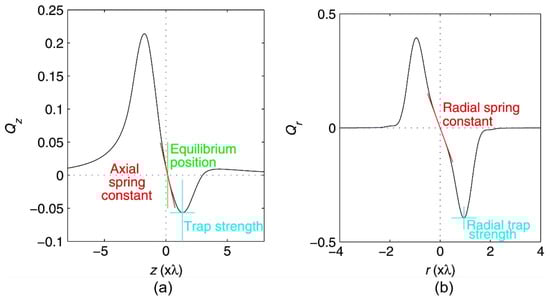 The relationships between the (a) axial and (b) radial optical forces exerted on a Rayleigh particle and their relative displacement to the equilibrium position in an optical trap [47]. The asymmetry of the axial force (in z direction) is due to the scattering force towards the direction of beam propagation.