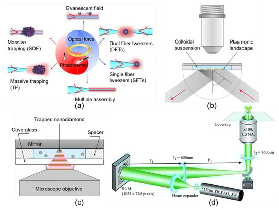 Illustration of implementation of several advanced optical trapping and manipulation techniques. (a) Overall elucidation of sub-wavelength diameter optical fiber (SDF) and tapered optical fiber (TF) based optical trapping established on the effects of photothermal or optical gradient field [74]. (b) Schematic diagram of surface plasmon (SP)-based near-field trapping realized by light source excitation of plasmonic resonance on the surface of a nanostructured substrate with required optical design [53]. (c) Illustration of a standing wave optical trap (SWOT) system generated by the interference between the incident and reflected laser beams within the sample chamber [54]. (d) Schematic diagram of a quadruple-channel holographic optical tweezers (HOTs) system. The trapping beam is reflected and reshaped into a designed pattern by the spatial light modulator (SLM) placed in the Fourier plane of the sample, which imprints the computer-generated holograms onto the wavefront [55].