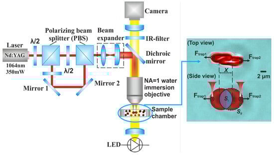 Particularly, spin and orbital angular momentum of the trapping light can be transferred to the trapping particles using modern tools including birefringent optical component, spiral phase plates, spatial light modulators, or q-plates [66]. For instance, weakly absorbing objects were rotated and moved along a given trajectory under the trapping beams with designed intensity and angular momentum distributions generated with special phase and amplitude-phase masks [67]. Advanced optical trapping with rotational manipulation has made it possible to introduce twist or apply torque to a biological system as well as to detect and analytically study the rotational movement of biological objects (e.g., bacterial flagellar motor) [32,68,69]. Attention has also been placed on building inexpensive OTs with commercially available optics and mounts for educational purposes [70,71]. Detailed guidance on the construction of different optical manipulation systems, including conventional single-beam OTs based on a homemade microscope, advanced holographic OTs and speckle OTs based on multi-mode optical fiber can be found in literature [72]. In studies of the characteristics of blood components and rheology at a single-cell level, the easy-to-implement and well-developed conventional dual-beam OTs are the most commonly used trapping geometry. In a typical dual-beam OTs system as shown in Figure 4 [73], by using polarizing beam splitters (PBS), one infrared laser beam is split into two polarization-based beams and focused by a large numerical aperture microscope objective. With beam positions being adjustable by rotating reflective mirrors or by moving the sample stage, two individual RBCs can be trapped and controlled simultaneously. Top-view monitoring and recording of the sample chamber enable further calculation and analysis of experimental observations.