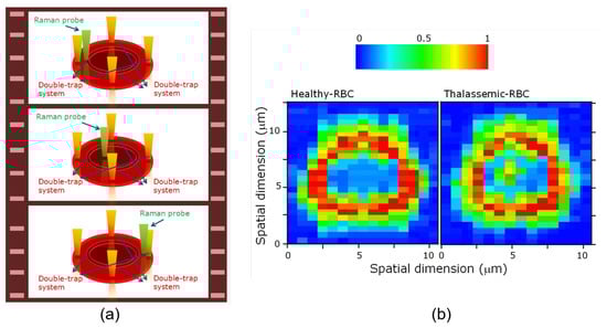 OTs are highly compatible with other measurement modalities, including Raman spectroscopy, fluorescence microscopy, absorption and photoluminescence spectroscopy [112]. The Raman spectrum based on the inelastic light scattering determined by molecular vibrations is capable of revealing the intrinsic molecular information, including the chemical constitution and structural conformation of macromolecules [113]. However, to avoid random displacing of cells from the confocal excitation volume, cell immobilization is required either physically or chemically. By combining OTs with Raman spectroscope, novel Raman tweezers have enabled the inelastic light scattering measurement from noninvasively fixed target cells one by one with great operation freedom and have shown wide potential in various biomedical and clinical applications. Specifically, diagnostic models for epithelial cancer [112], thalassemia (a hereditary hemolytic disease) [113,114] and type II diabetes [115] based on identification and discrimination of single cells of pathological samples by Raman tweezers have been developed. In Raman tweezers, the trapping and Raman excitation wavelengths can be selected separately according to sample properties and excitation requirements [113], whereas in some applications, the trapping laser was utilized simultaneously as Raman excitation beam [115]. With Raman tweezers, the altered protein constitution and hemoglobin oxygenation in abnormal or diseased RBCs can be detected by the significant variations in Raman spectra of noninvasively optically trapped RBCs without exogenous markers, enabling Raman tweezers to be a promising, convenient and label-free tool for accurate monitoring of hemoglobin-related blood disorders, including type II diabetes and - and -thalassemia [113,114,115]. As illustrated by Figure 6a, by scanning the equatorial plane of an RBC controlled by four optical traps through a Raman excitation probe (532 nm), the biomolecular characterization of single RBCs (i.e., hemoglobin distribution mapping) through recorded Raman spectra can be realized, and the healthy and thalassemic-RBCs can be noninvasively differentiated [113]. Compared to conventional thalassemia screening methods including Fourier-transform infrared (FT-IR) spectroscopy that require strict laboratory preparations and involve unwanted hemoglobin structural changes, Raman tweezers not only provide a simple, noninvasive and easy-to-implement alternative for thalassemia diagnosis, but also help with the investigation of the origin of the ineffective erythropoiesis in -thalassemia. In addition to cell immobilization, OTs can apply adjustable optical forces on the trapped cells to study the degree of deoxygenation induced by chemical or mechanical pressure (known as mechanochemical phenomenon) from the variations in the spectral intensity of several oxygenation-specific Raman peaks [116,117,118]. Other investigations including ABO blood typing [119] and malaria-infected blood sample characterization [120] have been performed with Raman tweezers. Raman spectroscopy has also been demonstrated efficient in discerning neoplastic cells from normal hematopoietic cells, making hybrid Raman tweezers a potentially powerful and sensitive tool for noninvasive single-cell cancer detection [121]. Indubitably, Raman tweezers, with the capability to differentiate healthy and abnormal RBCs accurately by detecting small changes in Raman spectra induced by mechanical, electrical, chemical and/or structural alterations in single RBCs, are highly promising for the future precise and noninvasive clinical diagnosis and for testing therapeutic responses to blood-targeted drugs.