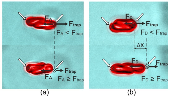 Illustration of measurements of RBC mutual interaction forces in RBC aggregates containing two cells [102]. (a) The aggregate is slightly stretched by two opposite end-points and the RBC aggregation force is measured by slowly decreasing the trapping strength until the optical force matches with the intercellular force and the cells escape from the traps. (b) The optical pulling force required to separate two RBCs is measured by slowly displacing the right trap away from the fixed left trap to destruct the original contact between the two cells until the cells escape from the traps. The white arrows indicate the trapping points (black crosses inside black circles).