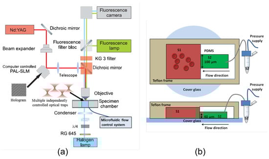 HOTs integrated with a microfluidic platform for assessing RBC aggregation mechanisms in changing solutions [78]. (a) Schematic diagram of the HOTs with four independent trapping channels. (b) Top view (top) and side view (below) of the microfluidic system (not in scale). RBC aggregates formed in solution 1 (S1) are trapped and moved to solution 2 (S2) for aggregation force measurements.