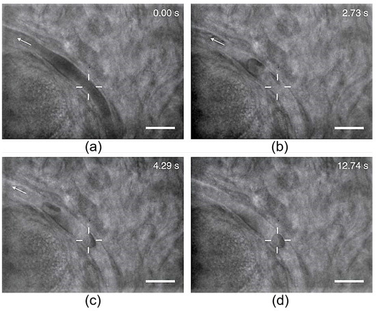 In vivo RBC trapping in a small capillary of a mouse ear [153]. (a) Single red blood cells (RBCs) are indistinguishable in the blood flow. (b) After several seconds of applying the OTs, the blood flow slows down and individual RBCs can be seen. (c) Successful trapping of a single RBC when the trapping force overcomes the flow dragging. (d) Stable trapping of the cell for over 10 s without influencing the normal flow of untrapped RBCs. White “+“ indicates the trapping position and the arrows show the blood flow direction with scale bars of 10 m.