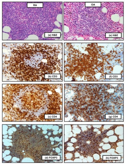 Histopathological examination of BM biopsies exhibited the presence of FOXP3+ positive cells among CD3+ and CD4+ lymphocytes in the BM obtained from RA and OA patients (Figure 1a–h). In order to quantify and analyze the phenotype of CD4+FOXP3+ cells in the BM of OA and RA patients, the BMMCs were isolated from both patient groups, and the phenotype of Tregs was examined by FACS analysis.