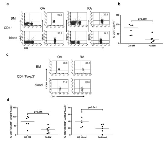 To evaluate whether CD4+FOXP3+ cells have the potential to migrate into and out the BM, we investigated their chemokine receptor CXCR4 expression that is fundamental for the recruitment of hematopoietic stem cell into the BM [19,22]. We found a significantly lower proportion of CD4+ T cells expressing CXCR4 in BM isolated from RA patients, in comparison with OA patients (Figure 3a,b). We also observed the lower proportion of CD4+FOXP3+ Tregs expressing CXCR4 in the BM and blood from RA patients in comparison with OA patients (Figure 3c,d), which may be at least partially responsible for their reduced trafficking to the BM and for the presence of decreased proportion of Tregs in the BM of RA patients.