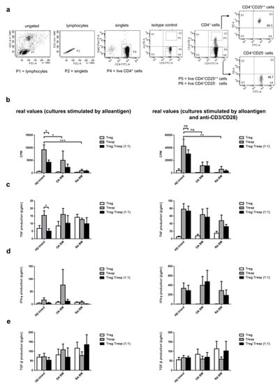 To investigate the suppression potential of Tregs, proliferation (or cytokine production) of Tresps and Tregs cultured together was compared with proliferation (or cytokine production) of Tresps cultured alone. Statistical significance was calculated comparing real values (cpm in case of proliferation and pg/mL in case of cytokines production).