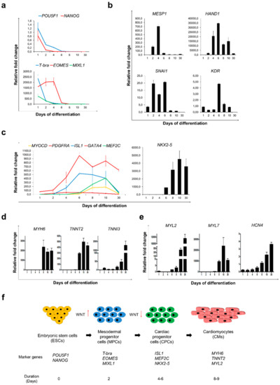 Using custom designed RT2 profiler PCR arrays, we performed step-by-step molecular analysis of Sulindac-induced cardiac differentiation to unravel the rapid changes in gene expressions leading to cardiogenesis. Figure S2A shows the heat map representing the expression profile changes in the 27 reference pluripotency, mesoderm, and cardiac development marker genes during the differentiation protocol. We observed significant downregulation of pluripotency markers POU5F1 and NANOG with simultaneous upregulation of early mesodermal and primitive streak markers like T-bra, EOMES and MIXL1 from day 1–4, transforming hESCs into mesodermal progenitor cells (MPCs) [25,26,27,28,29] (Figure 2a).
