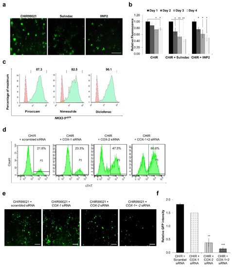 Cyclooxygenase inhibition plays an important role in cardiomyocytes differentiation. TCF reporter assay using IMR90-WNT reporter line: (a,b) The effect of Sulindac and IWP2 was examined. On day 0, CHIR99021 (10 μM) was added to activate Wnt signaling and TCF promoter activity from day 2 to day 4 cells were treated with Sulindac and IWP2. Fluorescence was recorded and images were captured on day 4. Scale bar, 100 μm (a), Error bars, ±SD; n = 3 independent biological replicates, (Student’s t test, * p ≤ 0.05, ** p ≤ 0.01, *** p ≤ 0.001) (b); (c) Representative FACS analyses for percent eGFP+ cells generated using Nimesulide, Diclofenac and Piroxicam. Control (red) indicates undifferentiated HES3 cells. (d) Representative FACS analyses for percent cTnT+ cells generated using COX-1, COX-2 and COX-1+2 siRNA. Undifferentiated IMR90 cells were used as control. (e,f) IMR90-WNT reporter cells were transfected with COX-1, COX-2 and COX-1+2 siRNAs after treatment with CHIR99021. Fluorescence images were captured on day 4 and analysed using ImageJ to obtain relative GFP intensities. Scale bar = 50 μm, Error bars, ±SEM; n = 3 independent biological replicates, (Student’s t test, * p ≤ 0.05, ** p ≤ 0.01, *** p ≤ 0.001).