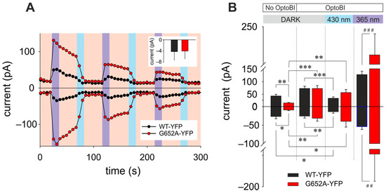 Manipulation of amplitude and temporal features of transient receptor potential canonical 3 (TRPC3) channel signaling patterns by photopharmacology and chemogenetics. (A) Representative time courses of the WT-YFP (white) and G652A-YFP (red) conductances recorded at −90 and 70 mV during repetitive photoconversion of OptoBI-1 (10 μM). Light illumination cycling is indicated as red (577 nm), UV (365 nm), and blue (430 nm). The insert shows mean ± SEM reversal potentials of currents through WT (black; n = 9) and G652A (red; n = 8) under bionic conditions ([Ca2+]o/[Cs+]i). (B) Basal (DARK), under blue and UV light application currents responses of WT-YFP and G652A-YFP in absence (No OptoBI) and presence of OptoBI-1 (10 μM). Currents obtained at −90 and 70 mV (mean ± SEM). Statistical significance was tested by two tailed t-test (normally distributed values, *) or Mann–Whitney tests (non-normally distributed values, #), * p < 0.05, ** p < 0.01, *** p < 0.001, if not indicated differences are not significant (p > 0.05).