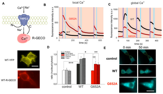 CMV-R-GECO1.2 construct (#45494) was obtained from Addgene (Teddington, UK). Wild-type TRPC3 fusion with R-GECO 1.1 (WT–R-GECO) was generated by inserting the hTRPC3 gene using KpnI restriction sites into CMV-R-GECO1.2. Mutant TRPC3G652A fusion with R-GECO 1.1 (G652A-R-GECO) was generated by using the one-step site directed plasmid mutagenesis protocol [19] and primers described above.