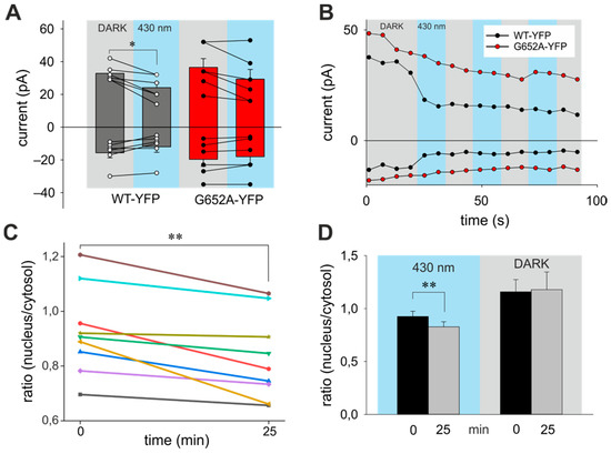 Trans photoisomerization of OptoBI-1 inhibits TRPC3 channel constitutive activity and basal NFAT1 nuclear localization. (A) Constitutive current levels of WT-YFP and G652A-YFP in presence of OptoBI-1 (10 μM) during blue light administration. Currents are shown for −90 and 70 mV (mean ± SEM). Statistical significance was tested by two tailed t-test (normally distributed values) or Mann–Whitney tests (non-normally distributed values), if not indicated—not significant (p > 0.05); (B) Representative time courses of the WT-YFP (white) and G652A-YFP (red) conductances recorded at −90 and 70 mV during repetitive photoconversion of OptoBI-1 (10 μM). Light illumination cycling is indicated as grey (DARK) and blue (430 nm); (C) nucleus/cytosol NFAT1 distribution responses are shown for individual cells. Fluorescent levels before (0 min) and after (25 min) blue light-induced changes in cells transfected with WT-R-GECO in presence of OptoBI-1 (10 μM; mean ± SEM); (D) mean ± SEM of nucleus/cytosol ratio NFAT1 translocation in WT-R-GECO-expressing HEK293 cells induced by OptoBi-1 non-illuminated (DARK) and illuminated with blue light stimulation (430 nm).
