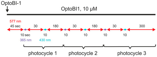 Schematic representation of OptoBI-1 application and illumination during [Ca2+]i imaging. OptoBI-1 was added before and kept during the whole recording. Light illumination is cycled as indicated in the Scheme 1: Red arrow (577 nm)—detection of R-GECO fluorescence, violet (365 nm)—photoconversion of trans-OptoBI-1 in cis-OptoBI-1, blue (430 nm)—photoconversion of trans-OptoBI-1 in cis-OptoBI-1. Timing of each photocycle as indicated.