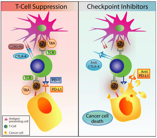 Checkpoint inhibitors as immunotherapy had elicited an impressive response in the treatment of melanoma and lung cancer; with so much potential, this type of immunotherapy was considered as Breakthrough of the Year in 2013 by the journal Science [33] and awarded the Nobel Prize in Medicine 2018 [34]. Immune checkpoint pathways are co-inhibitory signals that are manipulated during cancer to downregulate the immune response. Immune checkpoint inhibitors, such as Ipilimumab and Nivolumab, target the checkpoint pathway of cytotoxic T cells (CTL) though cytotoxic T-lymphocyte-associated protein 4 (CTLA-4) and programmed death 1 (PD-1), respectively. CLTA-4 is a receptor that is expressed on the surface of T cells and inactivates T cell activity by competing against CD28 to bind to the two T cell activation antigens CD80 and CD86, found on the surface of antigen-presenting cells (APC). In addition, the PD-1 receptor is also found on T cells, where, upon binding to the ligand PD-L1, induces a conformational change to an inactive and dysfunctional state [35]. As such, by targeting these two checkpoint pathways, the baseline of T cell activity can be restored to reactivate tumour immunosurveillance (Figure 2).