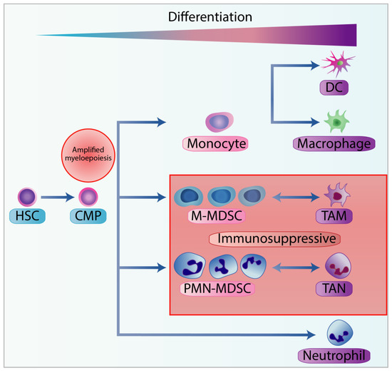Stages of myelopoiesis differentiation in cancer. Myelopoiesis is amplified during chronic inflammation to assist tumour progression and dissemination. The hematopoietic stem cells (HSC) differentiate into the common myeloid progenitor (CMP), which can further differentiate through the hematopoietic system. In physiological conditions, CMP can differentiate into neutrophils or into monocytes, and subsequently into dendritic cells (DC) or macrophages. However, with chronic inflammation, pro-inflammatory cytokines can skew the monocytopoiesis of CMP into monocytic-myeloid-derived suppressor cells (M-MDSC) and tumour-associated macrophages (TAM), and granulopoiesis into polymorphonuclear myeloid-derived suppressor cells (PMN-MDSC) and tumour-associated neutrophils (TAN).