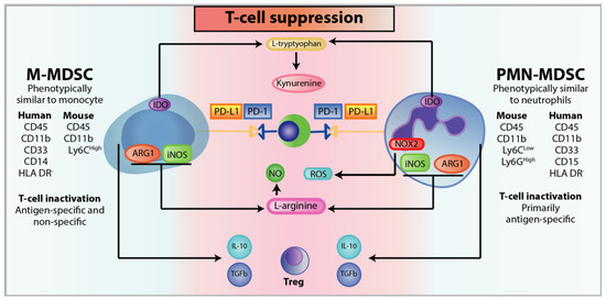 Activated MDSCs have an array of mechanisms that are utilised to create an immunosuppressive microenvironment, inducing anergy in NK cells and in CD4+ and CD8+ T-cells, and thus promoting immunetolerance in cancer. These include metabolic-based mechanisms that deplete essential amino acids for T-cell activity and proliferation, and mechanisms based on the secretion of specific factors involved in immunesuppression, such as the expression of PD-L1 by MDSCs [167]; expression of immunosuppressive cytokines such as IL-10 and TGFβ [114,168]; and recruitment of Tregs via expression of CD40 by MDSCs [87].