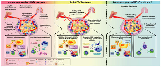Treatment of MDSC to alleviate an immunosuppressive environment as an approach to enhancing immunotherapeutic treatments by shifting towards an immunosupportive TME. The immunosuppressive TME is propagated by various suppressive cells such as MDSCs and Tregs. Recruitment of MDSC within the TME can promote tumour expansion through various mechanisms (developing a pre-metastatic niche to help cancer cell metastasis, inducing resistance to immunotherapy by preventing the infiltration of T-cell into the tumour, suppressing and deactivating T-cell function, and inducing T-cell apoptosis) and recruitment of Tregs to further amplify immunosuppression. Thus, MDSC is often associated with poor prognosis in patients. Anti-MDSC treatments have become a major clinical target to re-establish immune control against cancer. By creating an immunosupportive environment, T-cell activity is restored, which leads to improved immunotherapy efficacy. Overall, this has resulted in prolonged survival and reduction of metastasis and tumour regression.