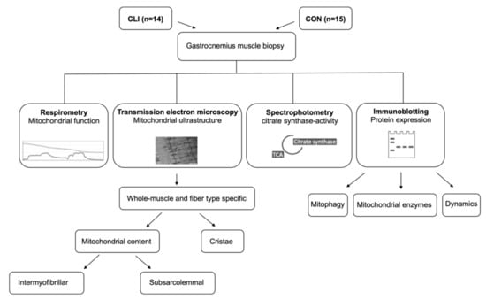 Experimental overview. Muscle biopsies were collected from 14 critical limb ischemia (CLI) patients and 15 control (CON) patients. Mitochondrial respiratory function was analyzed with high-resolution respirometry. Mitochondrial volumetric content and cristae surface area density were analyzed in whole muscle and stratified by fiber type with transmission electron microscopy. The volumetric content stratified by subcellular localization (intermyofibrillar, IMF; subsarcolemmal, SS) was also analyzed. Citrate synthase activity was analyzed with spectrophotometry. Expression of mitophagy-related proteins, fission/fusion-related proteins (dynamics), and mitochondrial enzymes involved in oxidative metabolism were analyzed with immunoblotting.