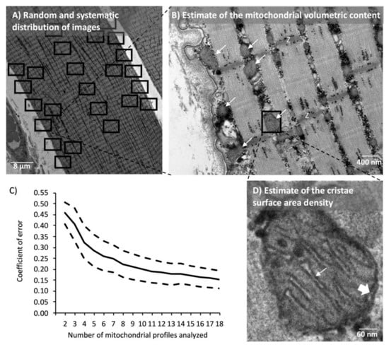 Analysis of mitochondrial volumetric content and cristae surface area density by transmission electron microscopy. (A) 24 images were photographed in a randomized systematic order. (B) Representative image used for the quantification of the mitochondrial volumetric content. White arrows point at examples of mitochondrial profiles. Z indicates Z-disc. (C) Mean (continuous line) and 95% CI (dashed lines) of coefficient of error after analysis of up to 18 profiles (n = 27 subjects). (D) Representative mitochondrial profile used for quantification of cristae surface area density. The thin arrow points at one cristae with a double-leaflet. The thick arrow points at an example of the double-leaflet of the outer membrane.