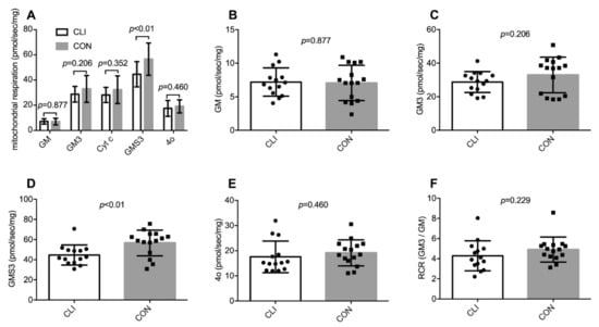 Mitochondrial respiration per mg muscle tissue for CLI (n = 14) and CON (n = 15) patients. (A) Summary of all respiratory states after addition of: glutamate and malate (GM), ADP (GM3), cytochrome c (cyt c), succinate (GMS3), and oligomycin (4o). (B–F) Individual values for all respiratory states and the respiratory control ratio (RCR) with complex I-linked substrates. Data are presented as means ± SD.