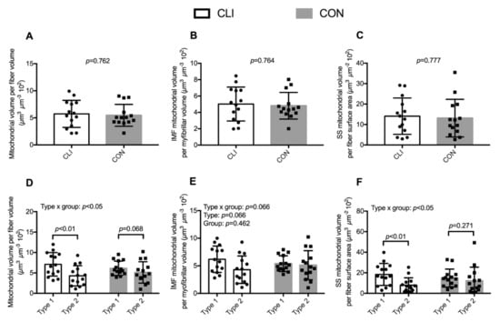 Mitochondrial content for CLI (n = 14) and CON (n = 14) patients. (A–C) Total, IMF, and SS mitochondrial volume fraction, respectively. (D–F) Total, IMF, and SS mitochondrial volume fraction stratified for fiber type, respectively. Data are presented as means ± SD. Overall linear mixed model effects are designated in the upper left corner of graphs D–F.