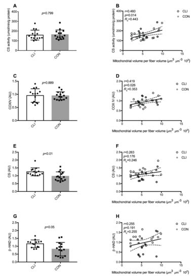 Markers of mitochondrial content. (A) Citrate synthase (CS) activity, (C) expression of cytochrome c oxidase subunit IV (COXIV), (E) CS, and (G) 3-hydroxyacyl-CoA dehydrogenase (β-HAD) for CLI (n = 14) and CON (n = 15). Data are presented as means ± SD. Association between (B) CS activity, (D) COXIV protein expression, (F) CS protein expression, (H) β-HAD protein expression and mitochondrial volumetric content for all patients pooled (CLI (n = 14) and CON (n = 14)). Data are presented as individual values with line of fit (95% CI). Pearson’s correlation coefficient (r), significance (p), and Lin’s coefficient of concordance (Rc) are designated in the upper left corners of the graphs.