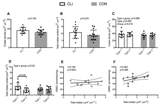 Whole-muscle (CLI: n = 13, CON: n = 14) and fiber-type-specific (CLI: n = 9, CON: n = 8) cristae density and content. (A) Whole-muscle cristae density, (B) fiber-type-specific cristae density, (C) whole-muscle total cristae content, and (D) fiber-type-specific total cristae content. Data are presented as means ± SD. Overall linear mixed model effects are designated in the upper left corners of graphs B and D. Association of whole-muscle total cristae content and GMS3 respiration for (E) CLI patients and (F) CON. Data are presented as individual values with line of fit (95% CI). Pearson’s correlation coefficient (r) and significance (p) are designated in upper left corners of the graphs.