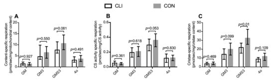Mitochondrial respiration per mitochondrial volumetric content, CS activity, and cristae content. (A) Mitochondrial volumetric content-specific respiration; CLI (n = 14) and CON (n = 14) patients, (B) CS activity-specific respiration; CLI (n = 14) and CON (n = 15), and (C) cristae-specific respiration; CLI (n = 13) and CON (n = 14). Respiratory states after addition of glutamate and malate (GM), ADP (GM3), succinate (GMS3), and oligomycin (4o). Data are presented as (B) means ± SD and (A, C) medians (25th−75th) percentile.