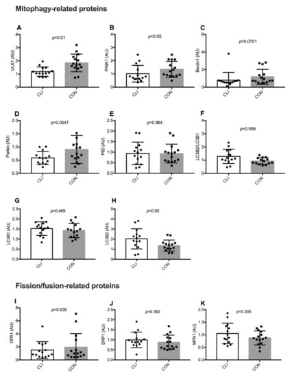 Expression of mitophagy and fission/fusion-related proteins for CLI (n = 14) and CON (n = 15) patients. (A) UNC-51-like kinase 1 (ULK1), (B) PTEN-induced kinase 1 (PINK1), (C) Beclin, (D) Parkin, (E) sequestosome-1 (P62), (F) ratio between microtubule-associated protein 1 light chain 3 beta (LC3B) 2 and 1, (G) LC3B1, (H) LC3B2, (I) optic atrophy-1 (OPA1), (J) dynamin-related protein-1 (DRP1), (K) Mitofusin-1 (MFN1). Data are presented as means ± SD (A, E, G, H, J, K) and medians (25th−75th) percentile (B, C, D, F, I).