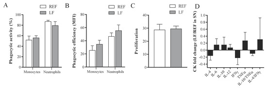 Figure 1. Systemic and intestinal immune cell function of dams at L14. The (A) phagocytic activity and (B) phagocytic efficiency of blood monocytes and neutrophils was measured. Moreover, (C) the proliferation of mesenteric lymph node lymphocytes was assessed after stimulation with CD3/CD28, and (D) cytokines in the supernatants were quantified by Luminex Technique. Results are expressed as mean ± S.E.M. (n = 6/group). The fold change was calculated with respect to REF group. REF, reference group; LF, Lactobacillus fermentum CECT5716 group; MFI, median fluorescence intensity; St., stimulated; CK, cytokines; SN, supernatants.