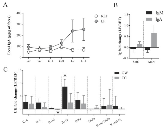 The fecal IgA concentration was analyzed throughout the study (Figure 2A). The amount of IgA was approximately 50–100 µg/g of feces during the gestation period in both groups (G0–G21), without showing differences between groups. However, after delivery (L7–L14), the levels of IgA were boosted in some of the LF group animals (>200 µg/g), although no statistical differences were observed when analyzing the whole group. In addition, tendencies were observed when calculating the area under the curve (p = 0.081) or calculating the increase of IgA from days G21 to L14 (p = 0.066).