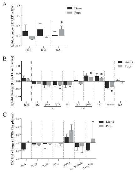 The systemic Ig were quantified in plasma at L14 (Figure 3B). The fold changes calculated between the LF and REF groups were similar both for dams and pups. On the one hand, the supplementation with Lactobacillus fermentum CECT5716 did not change the Ig profile of the dam, although a tendency to increase IgG2a was seen. On the other, the pups displayed significantly higher IgG2a (p < 0.05) and lower IgG2c concentrations. Overall, pups showed higher Th2-type Ig and consequently a reduction in the Th1/Th2 ratio (p < 0.05). Finally, the concentration of cytokines in serum was similar in both groups (Figure 3C).