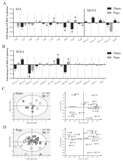 The analysis of principal components of the FAs revealed that the natural clustering of samples both in dams and pups was dependent on the supplementation, although the separation of the two experimental groups could be better observed in the dams (Figure 4C,D). The first three principal components explained 59.8% and 56.8% of the variance in the case of plasma FAs of dams and pups, respectively. According to the loading plots, it was observed that dam LF plasmas were positively correlated with 18:3 n-6, 18:1 n-9 and 18:1 n-7 contents while REF plasmas were positively correlated with 22:0, 18:3 n-3 or 20:5 n-3, among others. For pups, the separation of the LF group agreed with positive correlations with 17:0, 18:2 n-6 and 18:1 n-9, among others, while that of the REF group agreed with 16:0, 18:3 n-6 and 20:5 n-3, among others.