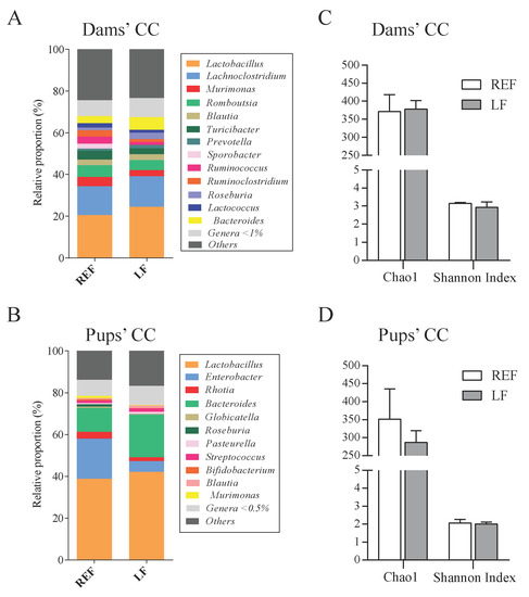 Figure 5. Cecal microbiota composition of dams’ and pups’ cecal content at L14. The main genera present in the cecal content are represented in stacked bars for (A) dams and (B) pups. Moreover, the richness of species and diversity of genera was analyzed by the calculation of Chao1 and Shannon Index, respectively, both for (C) dams and (D) pups. Results are expressed as mean ± S.E.M. (n = 3 animals/group). REF, reference group; LF, Lactobacillus fermentum CECT5716 group; CC, cecal content.