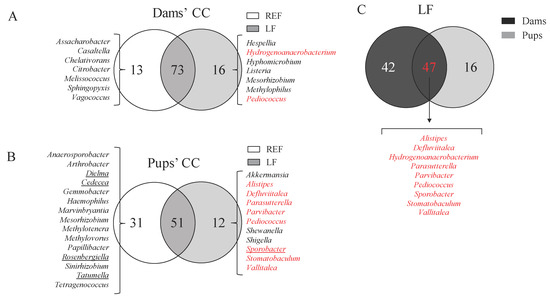 Figure 6. Venn diagrams of the genera present in the cecal content of dams and pups at L14. A bacterial group was considered as present by establishing a cutoff of two animals (out of the three samples analyzed) displaying proportions higher than 0.001%. Venn diagrams are represented for (A) dams’ CC, (B) pups’ CC and (C) the comparison of dams’ and pups’ CC for the LF group. Moreover, the genera highlighted in (A,B) correspond to those genera present in two or three animals in each group, and none of the animals in the other group. The animals underlined correspond to those which are present in 3/3 animals. The animals highlighted in red correspond to those which appear due to the supplementation with LF. Results are expressed as mean ± S.E.M. (n = 3 animals/group). REF, reference; LF, Lactobacillus fermentum CECT5716; CC, cecal content.