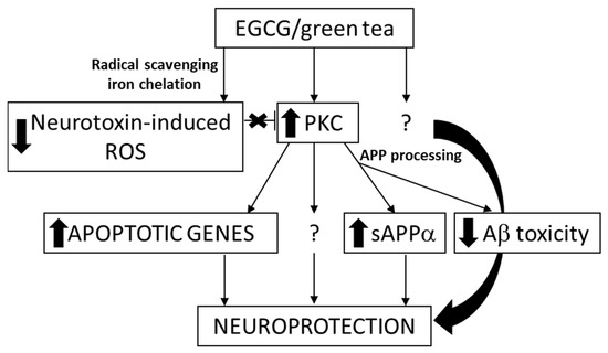 EGCG is also the major catechin that can be extracted from the polyphenolic fraction of green tea, where it accounts for 50% to 80% of the catechin content [60]. Several positive biological actions of this polyphenol in addition to its antioxidant properties, appear through specific mechanisms of action that include its interaction with proteins and specific receptors from the cell-surface membrane, and its regulation of cell signaling pathways and transcription, mitochondrial function [19,61], DNA methylation, and autophagy [62]. It was shown by in vivo studies in mice that EGCG reduces Aβ generation [63], modulates amyloid precursor cleavage, and reduce cerebral amyloidosis, and that it inhibits Aβ-induced cognitive dysfunction through modification of secretase activity [64,65]. The same polyphenol facilitates T-cell nuclear factor-κB inhibition and provides neuroprotection in autoimmune encephalomyelitis, an animal model of multiple sclerosis [66]. The potential targets involved in neuroprotection caused by EGCG are presented in Figure 2. The epidemiological studies on the association between tea consumption and the reduced risk of AD are reviewed and the anti-amyloid effects of related bioactivities in tea are summarized by Polito et al. [67].