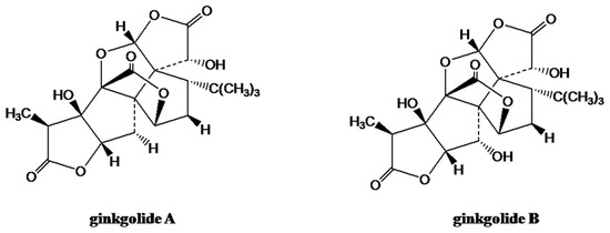 Ginkgo biloba L. is a dioecious tree that belongs to the Ginkgoceae family, and it is the oldest living species. Thus G. biloba is also called a ‘living fossil’, and it is traditionally used in Chinese herbal medicines [76]. Clinical studies have revealed that ginkgo extracts have therapeutic activities for a several different diseases, including age-related dementias, failing memory, eye ailments, vascular insufficiencies, congestive symptoms of premenstrual syndrome, and oxidative stress [77,78]. A standardized G. biloba extract (EGb 761) has been used as a natural treatment for cardiovascular and neurodegenerative diseases [79]. It consists primarily of the trilactone terpene ginkgolides (Figure 3) and flavonoids [80].