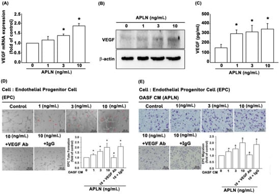 It is unclear as to whether any crosstalk exists between APLN and VEGF in synovium-induced angiogenesis. We found that APLN (0–10 ng/mL) dose-dependently stimulated transcription (SD values of 1.0, 1.14 ± 0.133, 1.358 ± 0.075, 1.881 ± 0.119, respectively) and translation (Figure 2A,B) of VEGF. APLN stimulated the excretion of VEGF protein by OASFs in a concentration-dependent manner (Figure 2C). The effects of APLN-mediated angiogenesis in OASFs were evaluated using EPC tube formation and migration assays [24]. CM from APLN-treated OASFs enhanced tube formation (Figure 2D) and migration (Figure 2E) in EPCs. EPC tube formation and migration induced by CM obtained from APLN-treated OASFs was abolished by VEGF antibody, whereas immunoglobulin G (IgG) had no such effects (Figure 2D,E), suggesting that APLN induces angiogenesis in a VEGF-dependent manner.