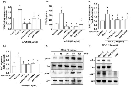 Src and Akt phosphorylation are involved in APLN-induced VEGF synthesis. (A,B) OASFs were pretreated with Src/Akt inhibitors for 30 min or Src/Akt siRNAs for 24 h, then incubated with APLN for 24 h. (A) VEGF mRNA levels were examined using RT-qPCR (n = 4), and (B) excreted VEGF protein levels were quantified using ELISA assay (n = 5). (C,D) After pretreatment with Src/Akt inhibitors or Src/Akt siRNA and incubation with APLN, the culture medium was collected and subjected to EPC (C) tube formation (n = 5) and (D) migration assays (n = 5). (E) OASFs were incubated with APLN, and the extent of Src/Akt phosphorylation was examined using Western blot analysis (n = 3). (F) OASFs pretreated with a FAK inhibitor before APLN incubation were assessed for the extent of Src/Akt phosphorylation, while OASFs pretreated with a Src inhibitor before APLN incubation were assessed for Akt phosphorylation (n = 3). * p < 0.05 compared with control; # p < 0.05 compared with the APLN-treated group.